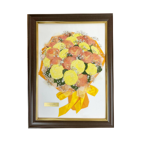 ブーケの形にこだわらず、全面に花を敷き詰めてアートなイメージのインテリア&思い出の花として飾りたいという方におススメです。